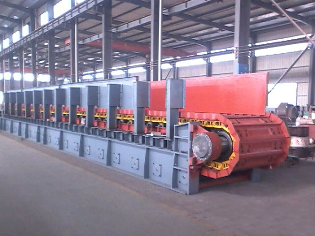 板式輸送機利用固接在牽引鏈上的一系列板條在水平或傾斜方向輸送物料的輸送機,以單片鋼板鉸接成環(huán)帶作為運輸機的牽引和承載構(gòu)件承載面具有橫向隔片置于槽箱中驅(qū)動環(huán)帶借隔片將煤刮運輸出。